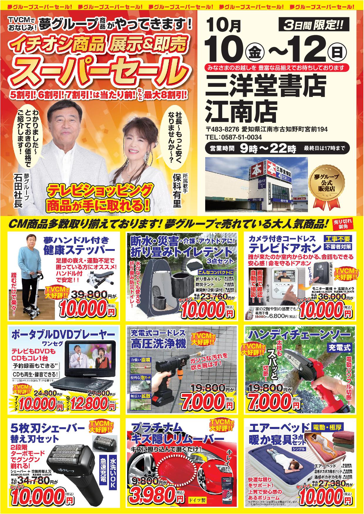 【江南店】夢グループのスーパーセール! 2025年10月2日 投稿 0 石田社長と歌手の保科有里さんのCMでおなじみ、「夢グループ」のスーパーセールを、三洋堂書店江南店で開催します! 3日間限定! 4割引き以上は当たり前のお得なセールです! ご来店をお待ちしております! 【開催期間】 2025年10月10日(金)~2025年10月12日(日) 三洋堂書店江南店 愛知県江南市古知野町宮前194 0587-51-0034 #夢グループ 記事をシェア 記事をポスト この記事は役に立ちましたか? 役に立った 0 前の記事を読む 【清洲店】夢グループのスーパーセール! 次の記事を読む 【土岐店】夢グループのスーパーセール!