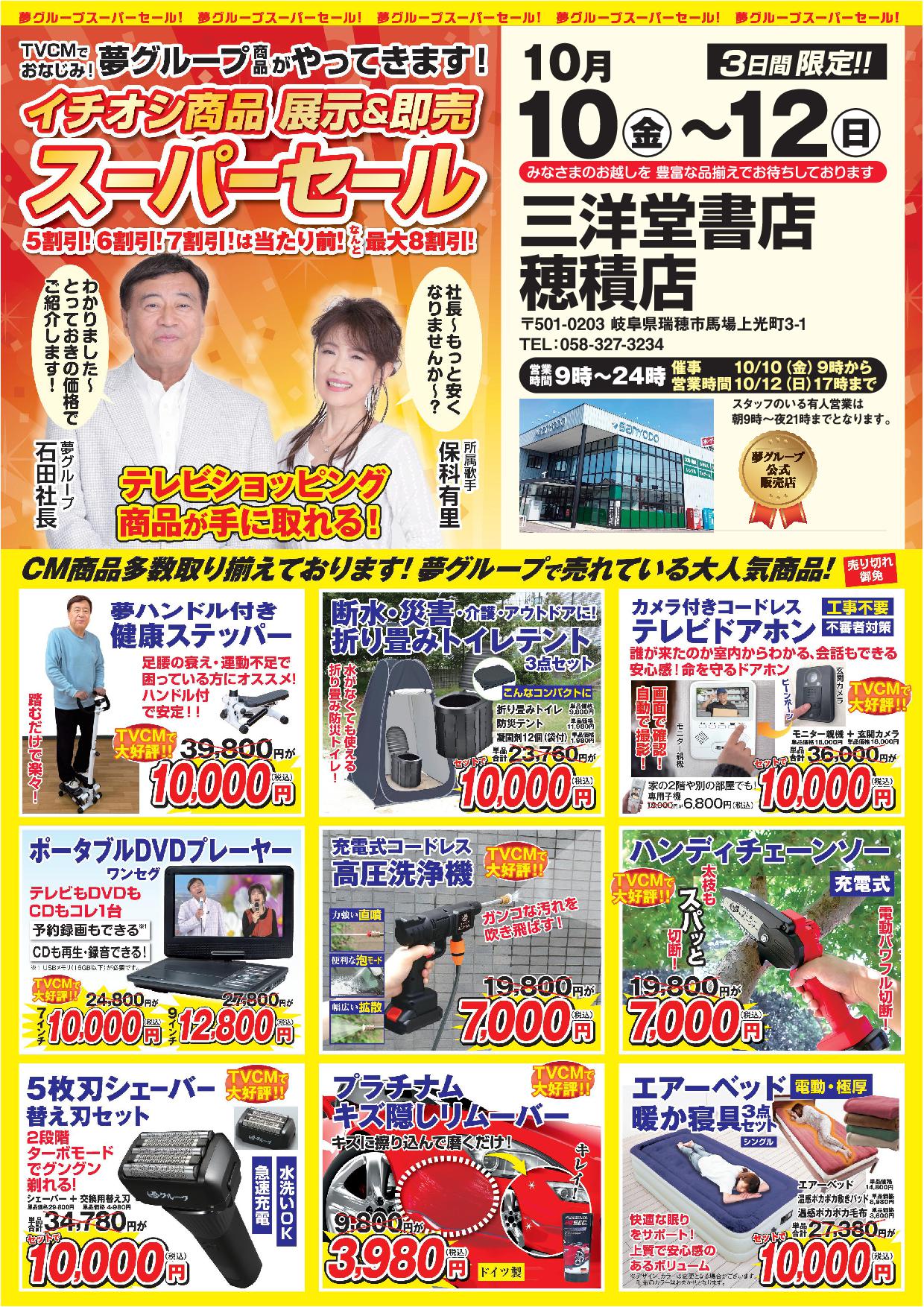 【穂積店】夢グループのスーパーセール! 2025年10月2日 投稿 0 石田社長と歌手の保科有里さんのCMでおなじみ、「夢グループ」のスーパーセールを、三洋堂書店穂積店で開催します! 3日間限定! 4割引き以上は当たり前のお得なセールです! ご来店をお待ちしております! 【開催期間】 2025年10月10日(金)~2025年10月12日(日) 三洋堂書店穂積店 岐阜県瑞穂市馬場上光町3丁目1 058-327-3234 #夢グループ 記事をシェア 記事をポスト この記事は役に立ちましたか? 役に立った 0 前の記事を読む 【土岐店】夢グループのスーパーセール! 次の記事を読む 【大垣バロー店】夢グループのスーパーセール!