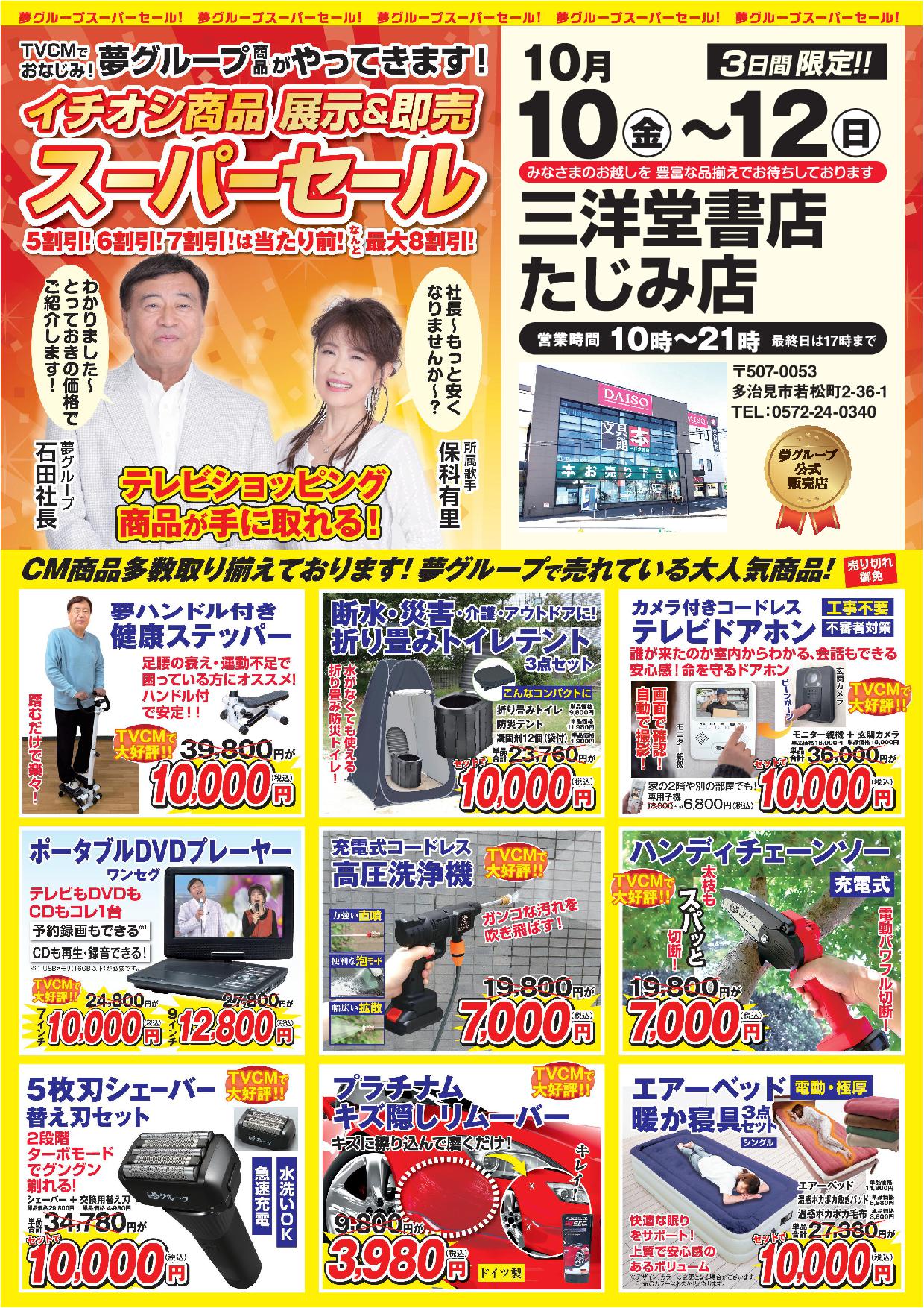 【たじみ店】夢グループのスーパーセール! 2025年10月2日 投稿 0 石田社長と歌手の保科有里さんのCMでおなじみ、「夢グループ」のスーパーセールを、三洋堂書店たじみ店で開催します! 3日間限定! 4割引き以上は当たり前のお得なセールです! ご来店をお待ちしております! 【開催期間】 2025年10月10日(金)~2025年10月12日(日) 三洋堂書店たじみ店 岐阜県多治見市若松町2丁目36番地1 0572-24-0340 #夢グループ 記事をシェア 記事をポスト この記事は役に立ちましたか? 役に立った 0 前の記事を読む 【大垣バロー店】夢グループのスーパーセール! 次の記事を読む 【富田店】夢グループのスーパーセール!