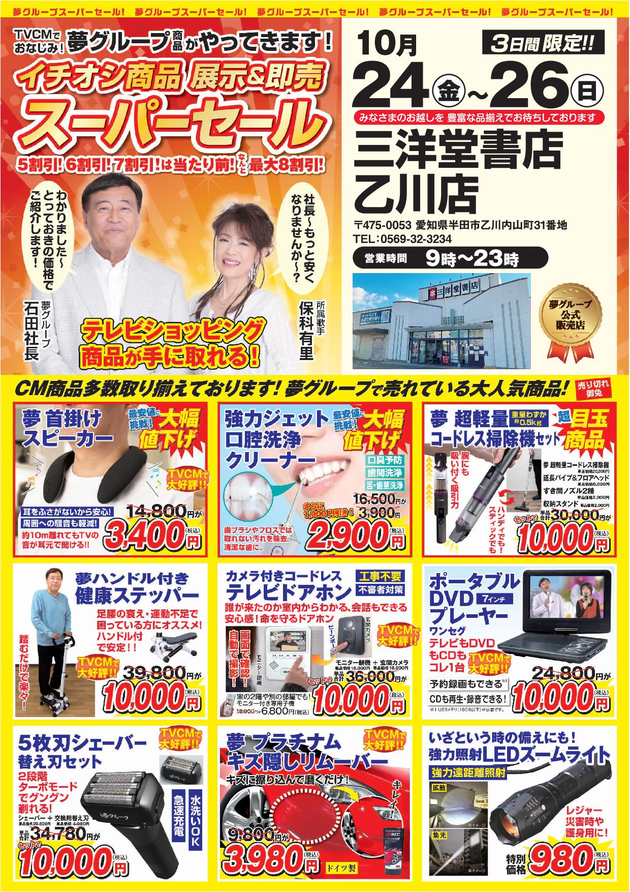 【乙川店】夢グループのスーパーセール! 2025年10月16日 投稿 0 石田社長と歌手の保科有里さんのCMでおなじみ、「夢グループ」のスーパーセールを、三洋堂書店乙川店で開催します! 3日間限定! 4割引き以上は当たり前のお得なセールです! ご来店をお待ちしております! 【開催期間】 2025年10月24日(金)~2025年10月26日(日) 三洋堂書店乙川店 愛知県半田市乙川内山町31番地 0569-32-3234 #夢グループ 記事をシェア 記事をポスト この記事は役に立ちましたか? 役に立った 0 前の記事を読む 【高浜Tぽーと店】夢グループのスーパーセール! 次の記事を読む 【いりなか店】夢グループのスーパーセール!