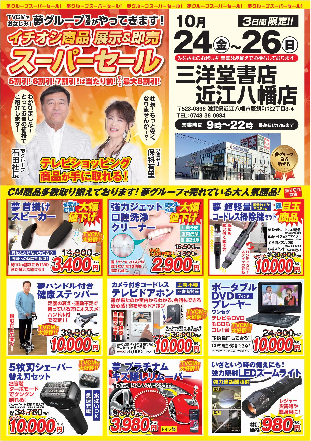 石田社長と歌手の保科有里さんのCMでおなじみ、「夢グループ」のスーパーセールを、三洋堂書店近江八幡店で開催します!