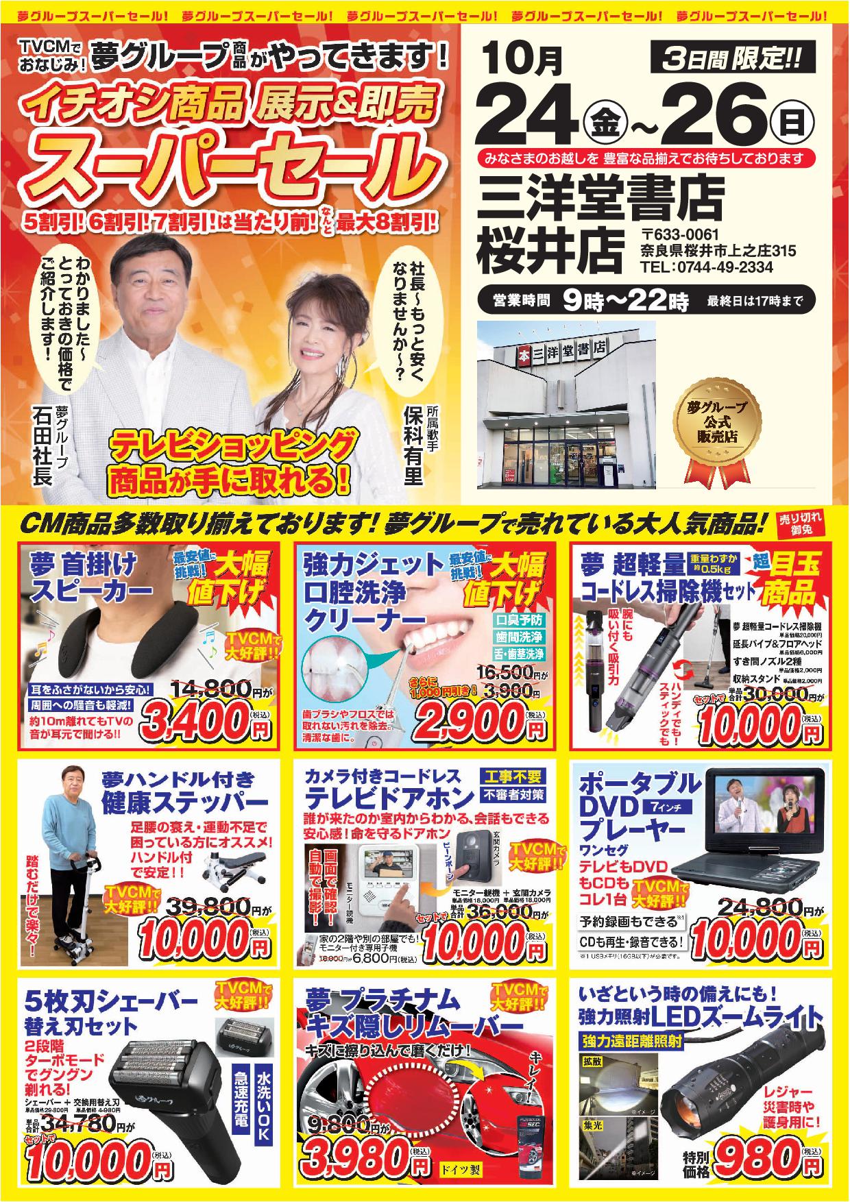 【桜井店】夢グループのスーパーセール! 2025年10月16日 投稿 0 石田社長と歌手の保科有里さんのCMでおなじみ、「夢グループ」のスーパーセールを、三洋堂書店桜井店で開催します! 3日間限定! 4割引き以上は当たり前のお得なセールです! ご来店をお待ちしております! 【開催期間】 2025年10月24日(金)~2025年10月26日(日) 三洋堂書店桜井店 奈良県桜井市上之庄315番地 0744-49-2334 #夢グループ 記事をシェア 記事をポスト この記事は役に立ちましたか? 役に立った 0 前の記事を読む 【豊郷店】夢グループのスーパーセール! 次の記事を読む 【小浜店】夢グループのスーパーセール!