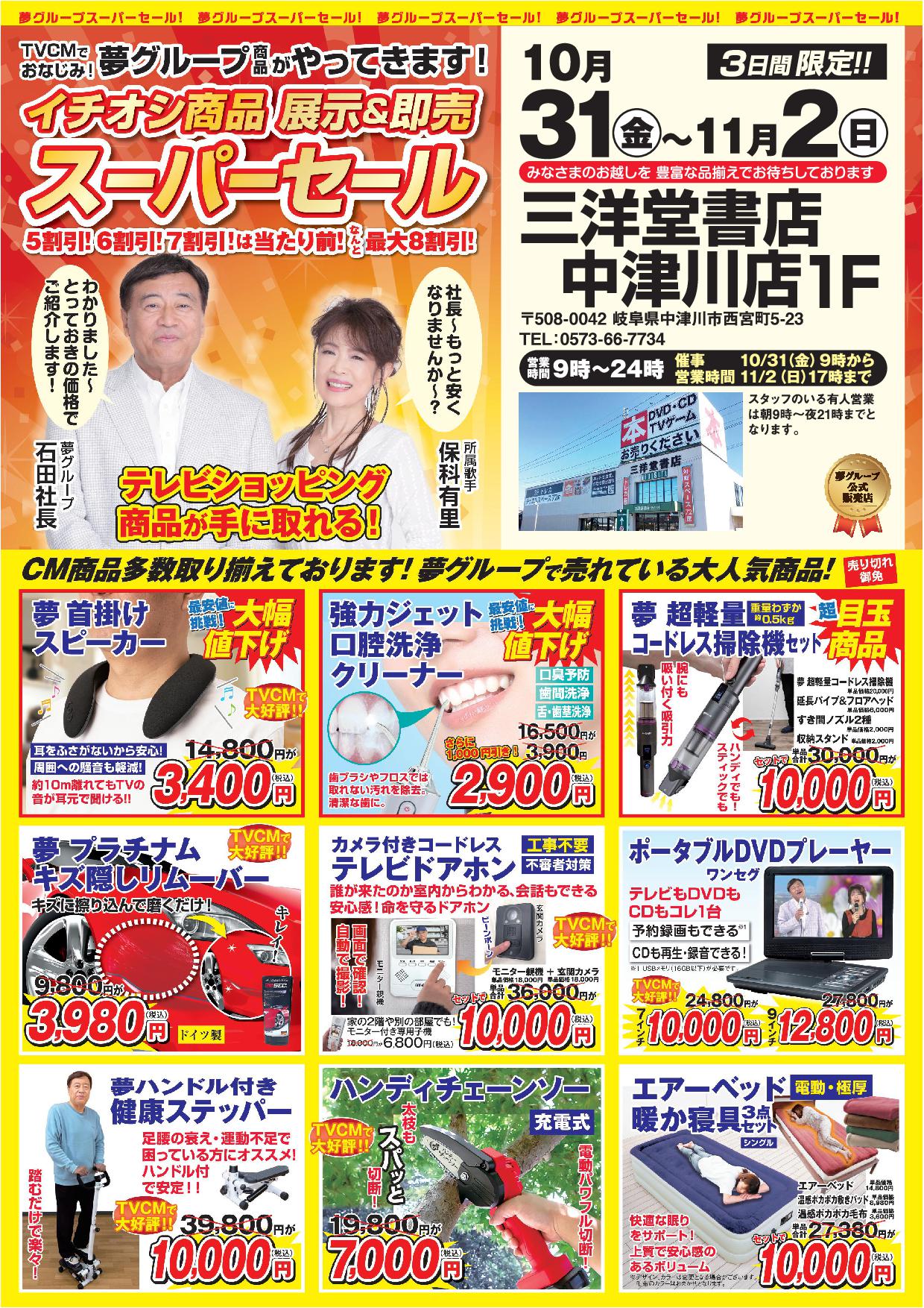 【中津川店】夢グループのスーパーセール! 2025年10月22日 投稿 0 石田社長と歌手の保科有里さんのCMでおなじみ、「夢グループ」のスーパーセールを、三洋堂書店中津川店で開催します! 3日間限定! 4割引き以上は当たり前のお得なセールです! ご来店をお待ちしております! 【開催期間】 2025年10月31日(金)~2025年11月2日(日) 三洋堂書店中津川店 岐阜県中津川市西宮町5番23号 0573-66-7734 #夢グループ 記事をシェア 記事をポスト この記事は役に立ちましたか? 役に立った 0 前の記事を読む 【志段味店】夢グループのスーパーセール! 次の記事を読む 京都アニメーション主催「京アニ・アニメ絵・展」 イベント