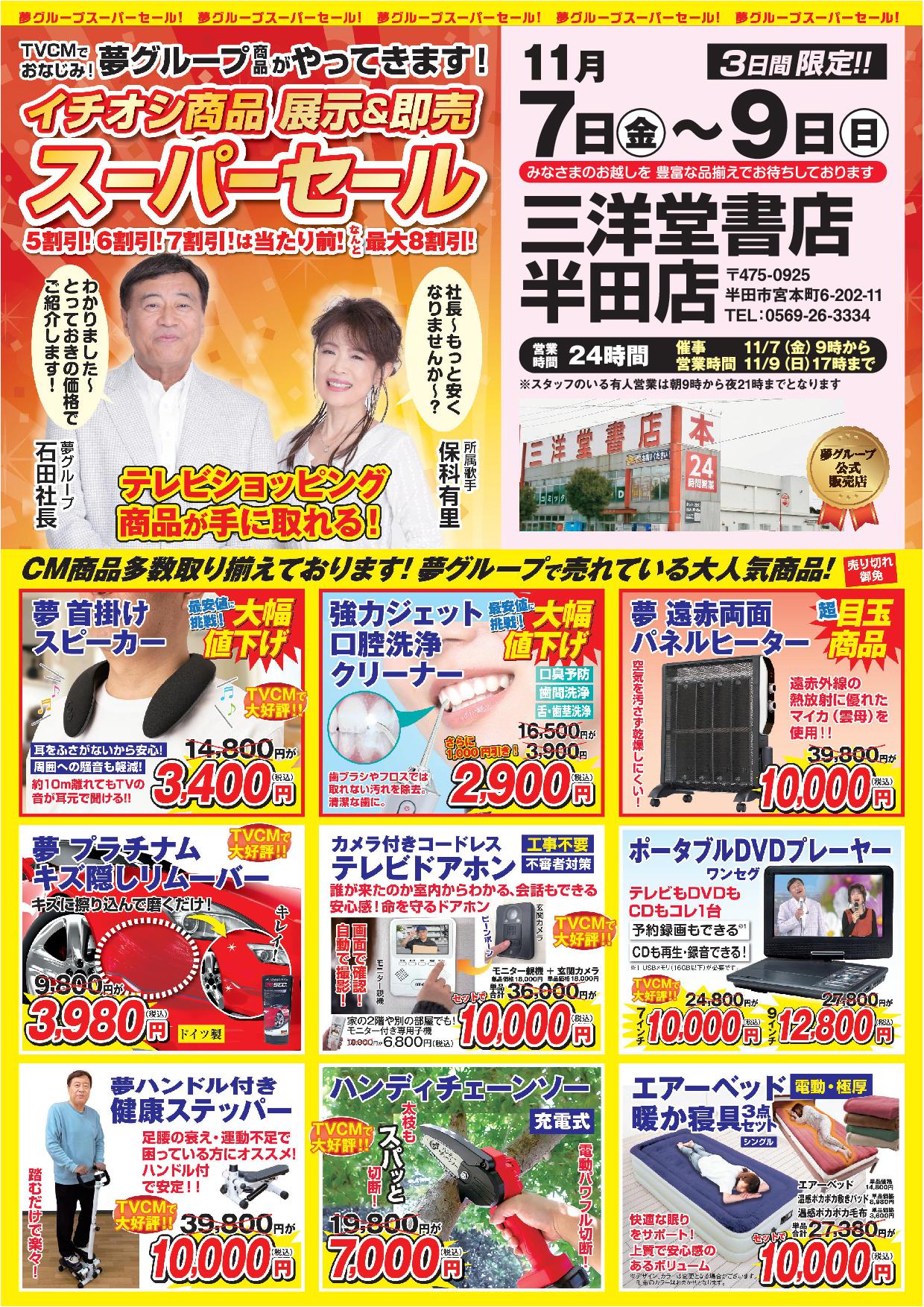 石田社長と歌手の保科有里さんのCMでおなじみ、「夢グループ」のスーパーセールを、三洋堂書店半田店で開催します!