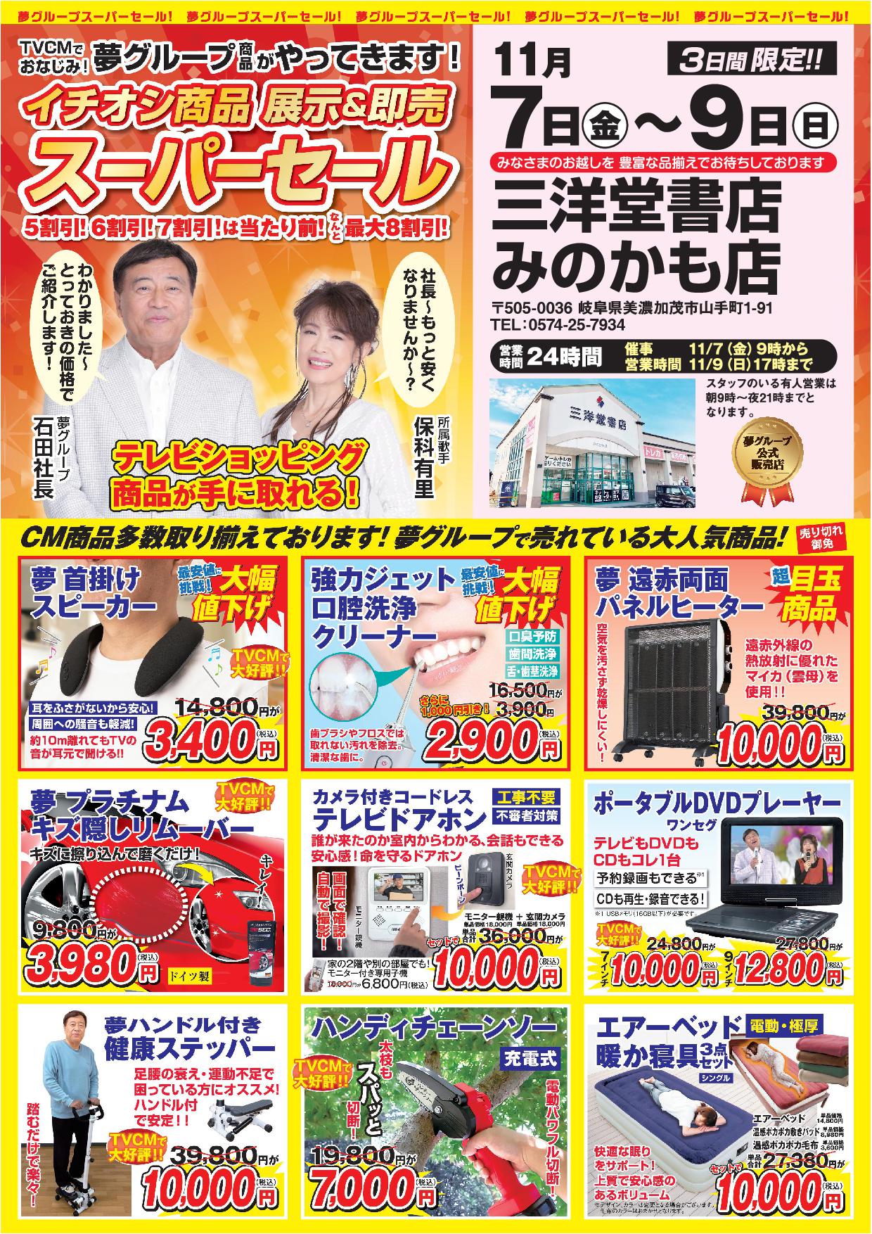 石田社長と歌手の保科有里さんのCMでおなじみ、「夢グループ」のスーパーセールを、三洋堂書店みのかも店で開催します!
