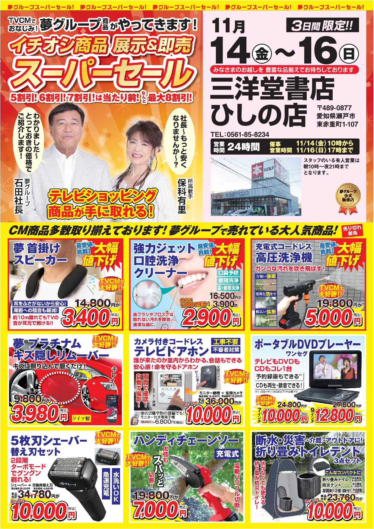【ひしの店】夢グループのスーパーセール! 2025年11月5日 投稿 0 石田社長と歌手の保科有里さんのCMでおなじみ、「夢グループ」のスーパーセールを、三洋堂書店ひしの店で開催します! 3日間限定! 4割引き以上は当たり前のお得なセールです! ご来店をお待ちしております! 【開催期間】 2025年11月14日(金)~2025年11月16日(日) 三洋堂書店ひしの店 愛知県瀬戸市東赤重町1丁目107番地 0561-85-8234 #夢グループ 記事をシェア 記事をポスト この記事は役に立ちましたか? 役に立った 0 前の記事を読む 【知立店】夢グループのスーパーセール! 次の記事を読む 【新開橋店】夢グループのスーパーセール!