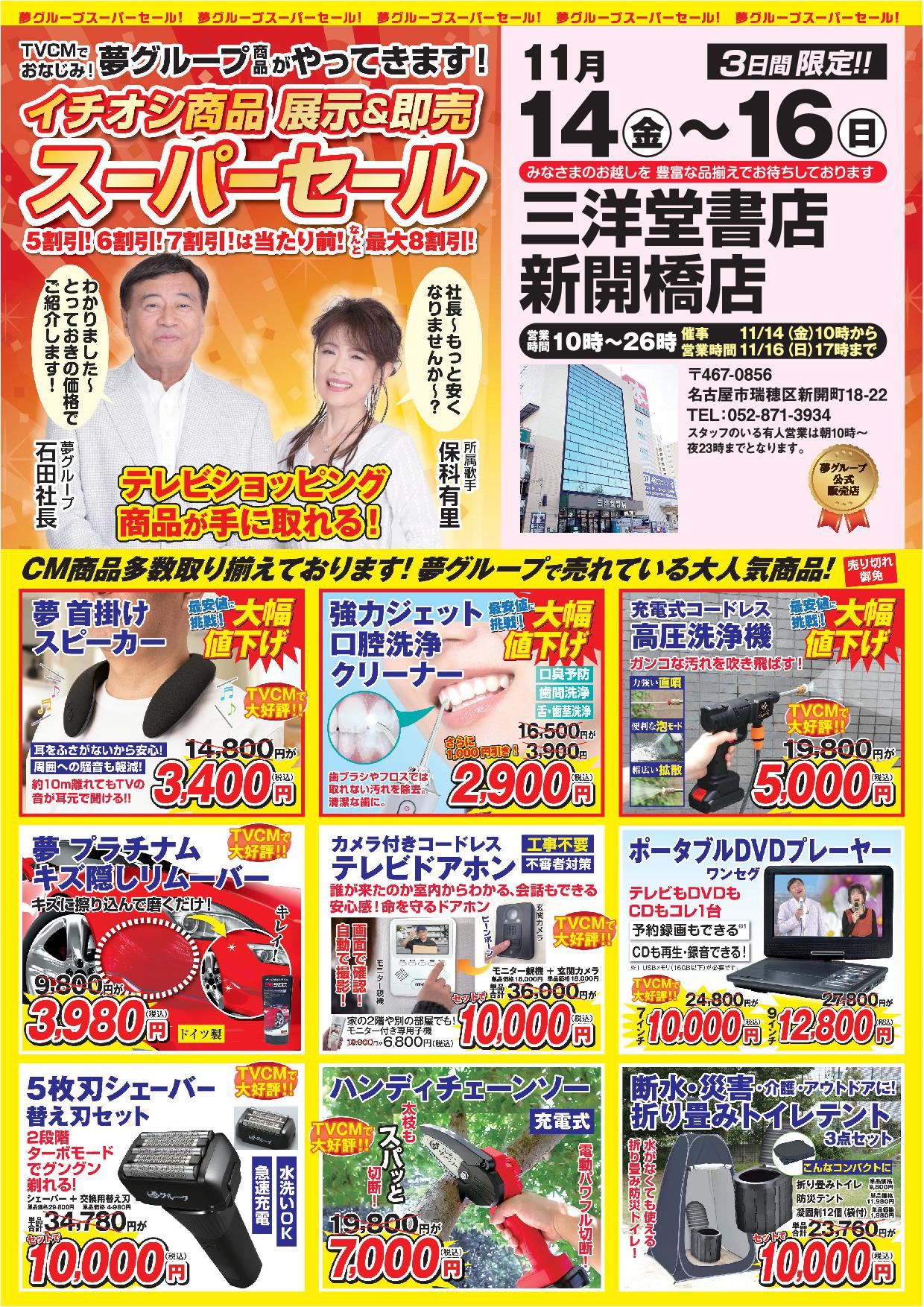 【新開橋店】夢グループのスーパーセール! 2025年11月5日 投稿 0 石田社長と歌手の保科有里さんのCMでおなじみ、「夢グループ」のスーパーセールを、三洋堂書店新開橋店で開催します! 3日間限定! 4割引き以上は当たり前のお得なセールです! ご来店をお待ちしております! 【開催期間】 2025年11月14日(金)~2025年11月16日(日) 三洋堂書店新開橋店 愛知県名古屋市瑞穂区新開町18番地22 052-871-3934 #夢グループ 記事をシェア 記事をポスト この記事は役に立ちましたか? 役に立った 0 前の記事を読む 【ひしの店】夢グループのスーパーセール! 次の記事を読む 【城山店】夢グループのスーパーセール!