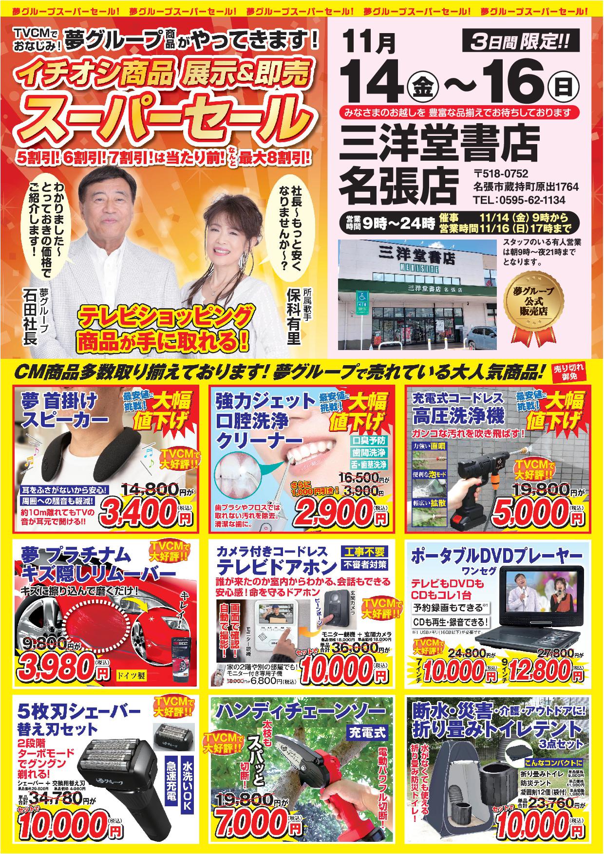 【名張店】夢グループのスーパーセール! 2025年11月5日 投稿 0 石田社長と歌手の保科有里さんのCMでおなじみ、「夢グループ」のスーパーセールを、三洋堂書店名張店で開催します! 3日間限定! 4割引き以上は当たり前のお得なセールです! ご来店をお待ちしております! 【開催期間】 2025年11月14日(金)~2025年11月16日(日) 三洋堂書店名張店 三重県名張市蔵持町原出1764番地 0595-62-1134 #夢グループ 記事をシェア 記事をポスト この記事は役に立ちましたか? 役に立った 0 前の記事を読む 【近江八幡店】夢グループのスーパーセール! 次の記事を読む 【サイト会員限定】本の買取20%UPキャンペーン!! セール・キャンペーン