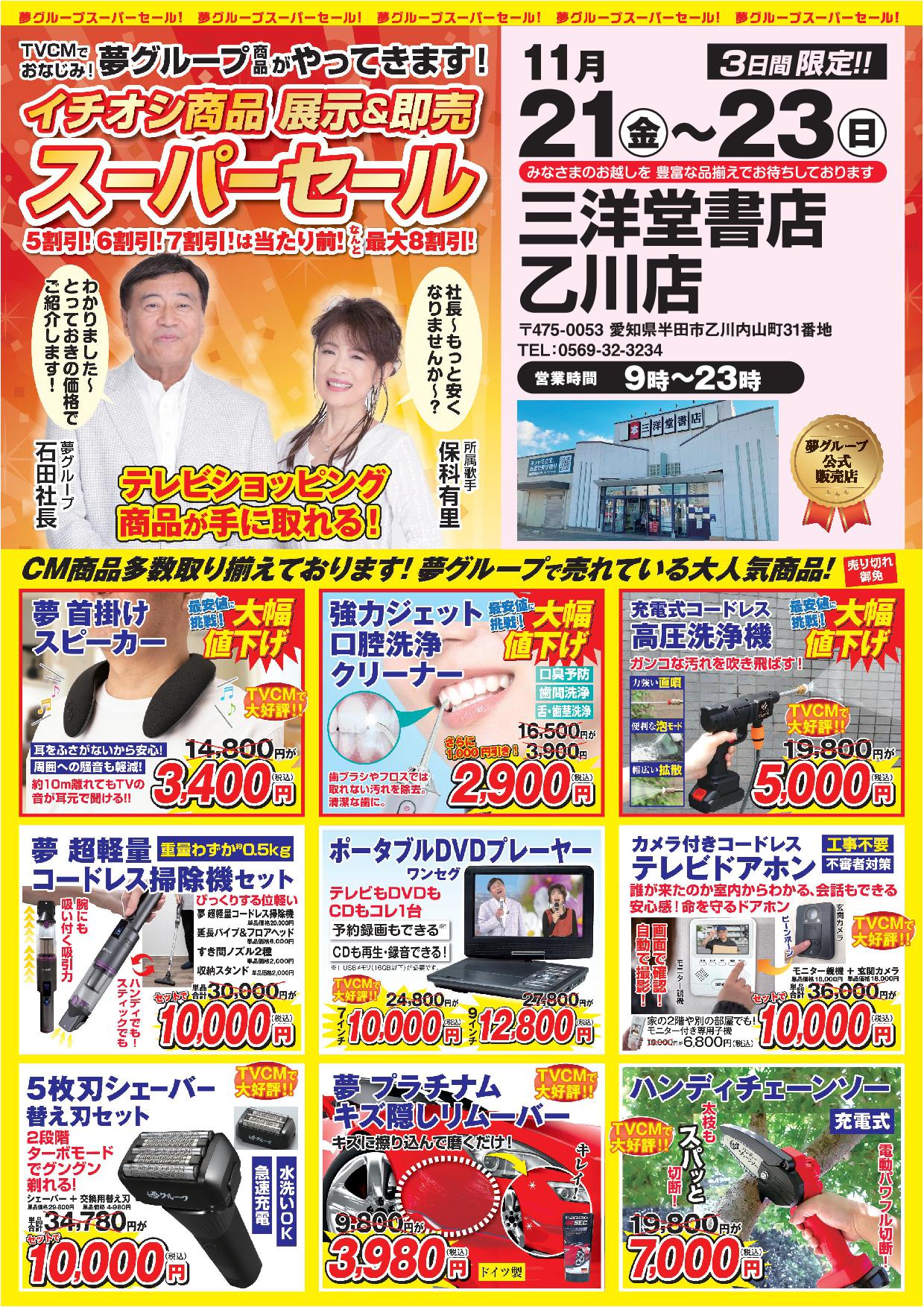 石田社長と歌手の保科有里さんのCMでおなじみ、「夢グループ」のスーパーセールを、三洋堂書店乙川店で開催します!