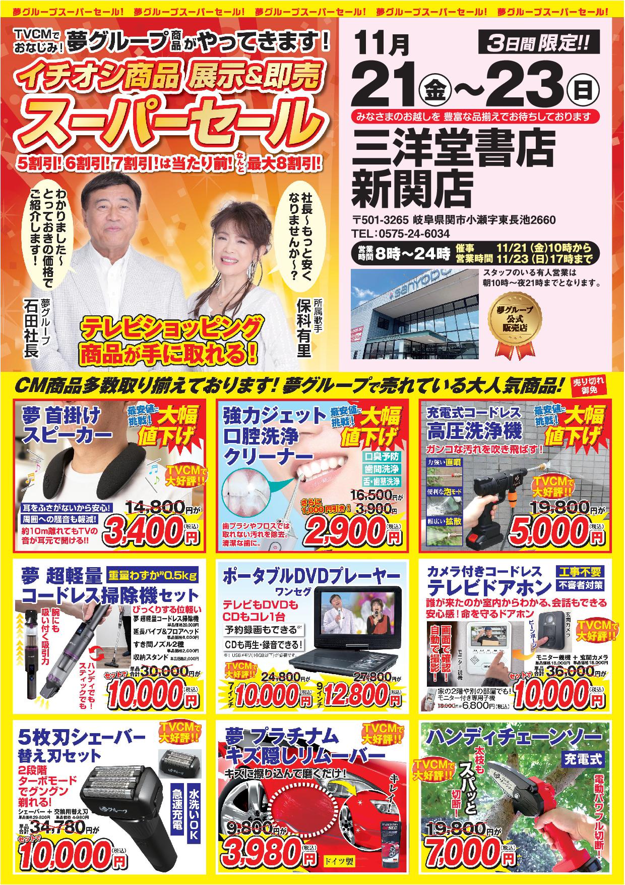 【新関店】夢グループのスーパーセール! 2025年11月13日 投稿 0 石田社長と歌手の保科有里さんのCMでおなじみ、「夢グループ」のスーパーセールを、三洋堂書店新関店で開催します! 3日間限定! 4割引き以上は当たり前のお得なセールです! ご来店をお待ちしております! 【開催期間】 2025年11月21日(金)~2025年11月23日(日) 三洋堂書店新関店 岐阜県関市小瀬字東長池2660 0575-24-6034 #夢グループ 記事をシェア 記事をポスト この記事は役に立ちましたか? 役に立った 0 前の記事を読む 【高山店】夢グループのスーパーセール! 次の記事を読む 【大和店】夢グループのスーパーセール!