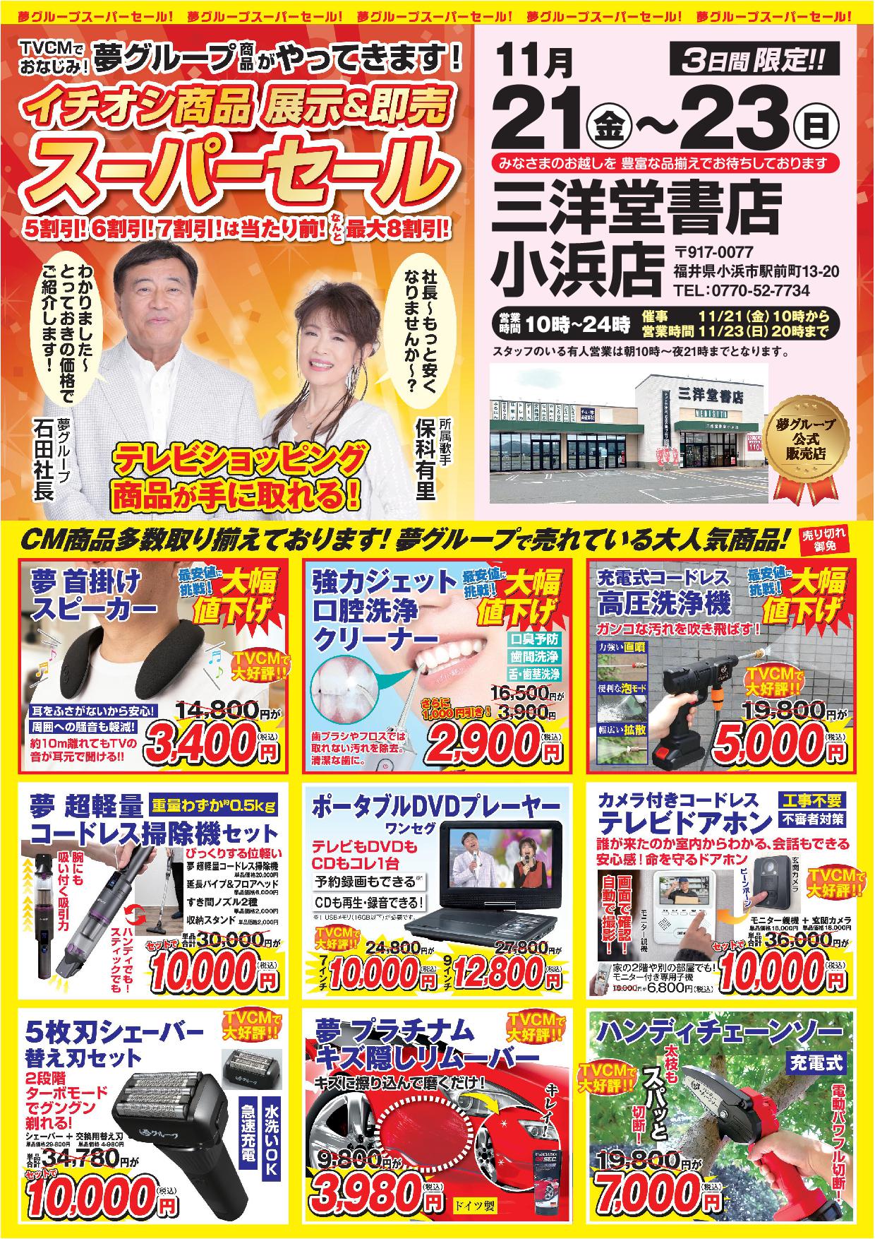 【小浜店】夢グループのスーパーセール!! 2025年11月13日 投稿 0 石田社長と歌手の保科有里さんのCMでおなじみ、「夢グループ」のスーパーセールを、三洋堂書店小浜店で開催します! 3日間限定! 4割引き以上は当たり前のお得なセールです! ご来店をお待ちしております! 【開催期間】 2025年11月21日(金)~2025年11月23日(日) 三洋堂書店小浜店 福井県小浜市駅前町13番20号 0770-52-7734 #夢グループ 記事をシェア 記事をポスト この記事は役に立ちましたか? 役に立った 0 前の記事を読む 【菰野店】夢グループのスーパーセール! 次の記事を読む 【松原 凛】愛知県在住の物書き 連載小説